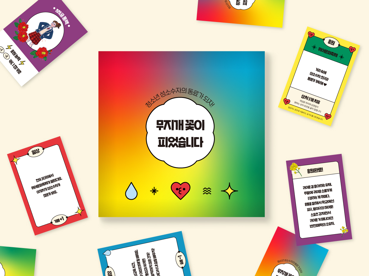 학교나 청소년 동아리, 모임, 그룹 등 다양한 곳에서 <무지개 꽃이 피었습니다> 보드게임을 활용해 청소년 성소수자의 든든한 동료가 되어주세요!