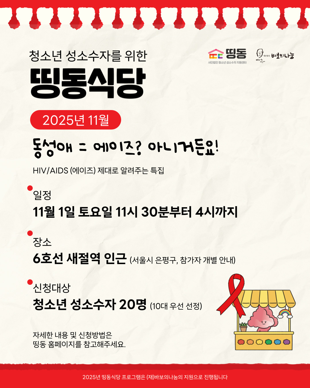 | HIV/AIDS에 대해 알아가고 싶은 청소년 성소수자2002년 이후 출생자 라면 누구나 신청할 수 있어요.(10대 우선 선정) |
