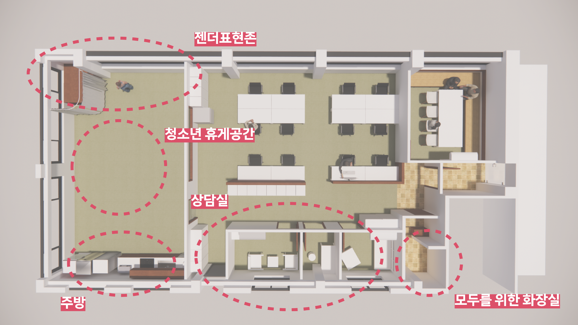 안전하게 내 이야기를 할 수 있는 상담실 2개, 비수도권 지역 청소년과 상담할 수 있는 전화상담실 1개, 상담에 필요한 도서와 자료를 보관할 책장, PC, 책상